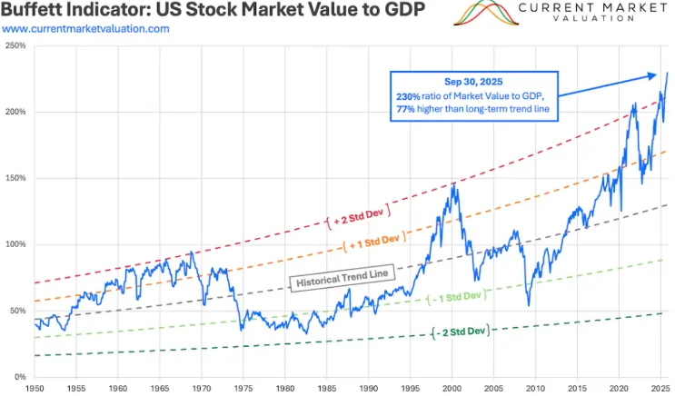 At the same time, the divergence between financial markets and the real economy widened materially. The Buffett Indicator, measuring total U.S. equity market capitalization relative to GDP, has moved more than two standard deviations above its long-term trend, levels historically associated with elevated valuation risk.