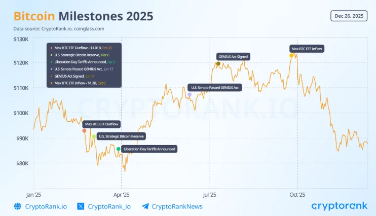 In 2025, Bitcoin’s price behavior became noticeably more volatile and macro-sensitive than in prior cycles, signaling a shift away from pure speculative momentum toward an asset increasingly shaped by institutional flows, regulatory developments, and broader risk sentiment. Bitcoin reached new all-time highs above $126,000, supported by strong spot ETF inflows, strategic reserve narratives, and expectations of easier monetary policy. However, these levels proved unsustainable, with prices retracing into the $80,000–$90,000 range by year-end.