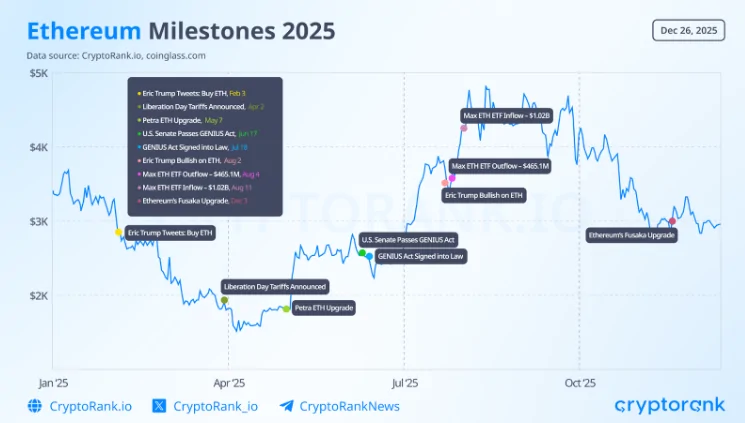 In contrast to Bitcoin’s relatively resilient performance in 2025, Ethereum exhibited significantly higher volatility, despite being influenced by the same macroeconomic forces. ETH began the year above $3,000 but suffered deep drawdowns, falling to multi-year lows near $1,500 in April amid renewed tariff pressure under Trump’s trade policy and a broader market sell-off. Prices later recovered, briefly reaching a new all-time high above $4,900 in August, before retracing toward the $3,000 level by year-end—mirroring the familiar “buy the rumor, sell the news” pattern also observed in Bitcoin.