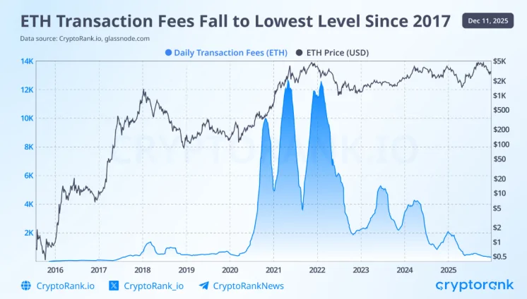 Beneath the price action, however, on-chain fundamentals pointed to meaningful structural progress. Two major protocol upgrades in 2025, Petra and Fusaka, enhanced execution efficiency, validator reliability, and rollup data availability, strengthening Ethereum’s role as a settlement layer for Layer-2 networks. Following these upgrades, average gas fees declined to their lowest levels since 2017, highlighting a substantial improvement in network efficiency.