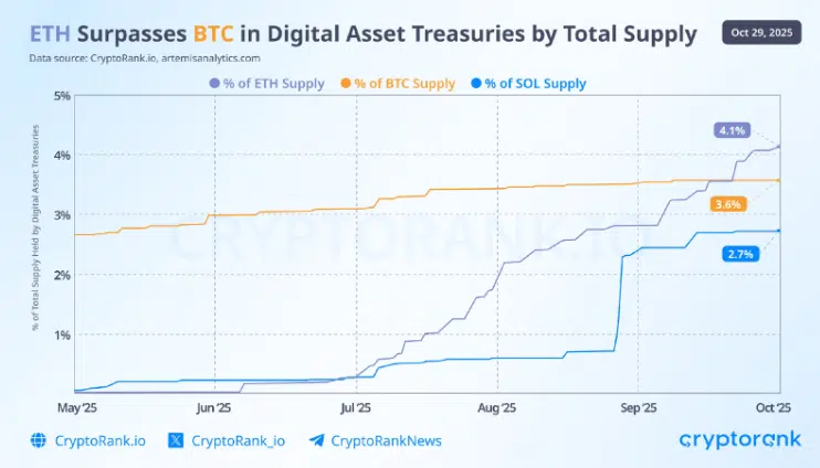 Digital asset treasuries also emerged as an increasingly important factor in ETH price formation. Their share of total ETH supply rose from below 1% in July to over 4% by October, surpassing the proportion of Bitcoin held by comparable treasury vehicles. Unlike BTC-focused strategies, ETH treasury holders can deploy staking and DeFi-based yield strategies, introducing the potential for non-dilutive returns on treasury capital.