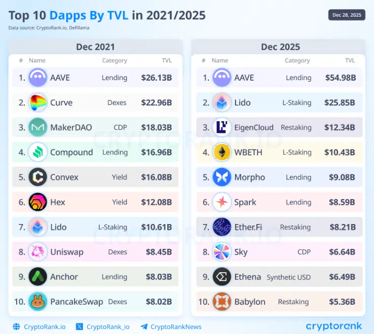 Changes among the top 10 protocols by TVL over the past four years reveal a clear evolution in DeFi’s market structure. A four-year horizon is long enough to capture durable leadership rotation, filtering out short-term cycles while highlighting shifts in where capital ultimately concentrates.