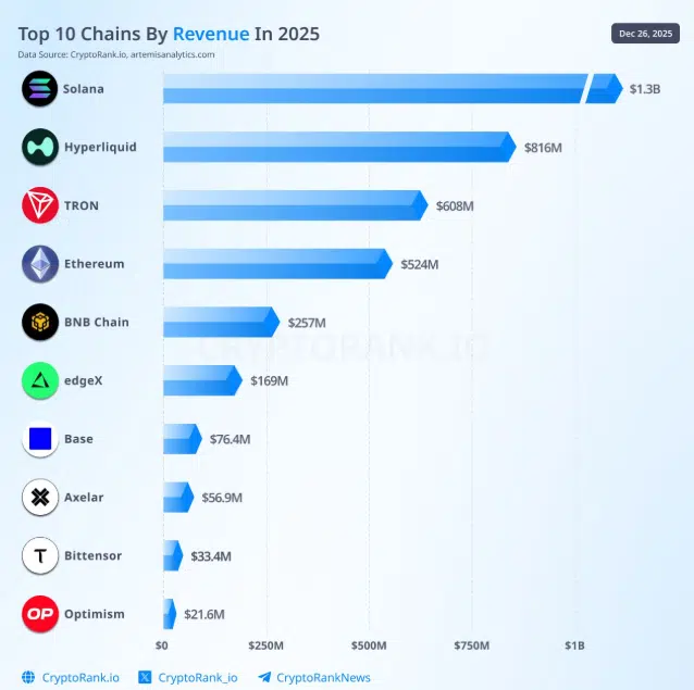 Despite this, overall DEX volume rebounded from a March low and steadily recovered through the year. Total volume reached $1.55T, securing Solana’s position as the top chain by DEX volume. In parallel, Solana generated $1.3B in revenue in 2025, the highest of any blockchain.