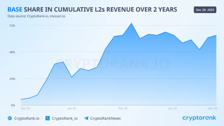 Base delivered one of its strongest years to date, expanding across DeFi and payments. For the first time, it reached $400M in monthly transactions, $53B in monthly DEX volume, and $10B in TVL. This places Base fifth among all chains by TVL and first among L2s. Revenue dominance was even clearer: Base led all L2s every month in 2025, with its share of cumulative L2 revenue reaching 69% by November.