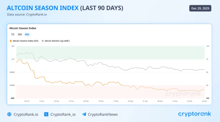 It is safe to say that the altcoin season many expected in 2025 never arrived. While several large-cap tokens managed to set new ATHs (BNB, SOL, HYPE), their momentum was short-lived, with most now down 40–50%. Bitcoin dominance did not fall below 50% this year, with the lowest level recorded on January 2. The Altcoin Season Index (ASI) briefly hovered around 80 in September but has since dropped below 30 and remained there for several months.