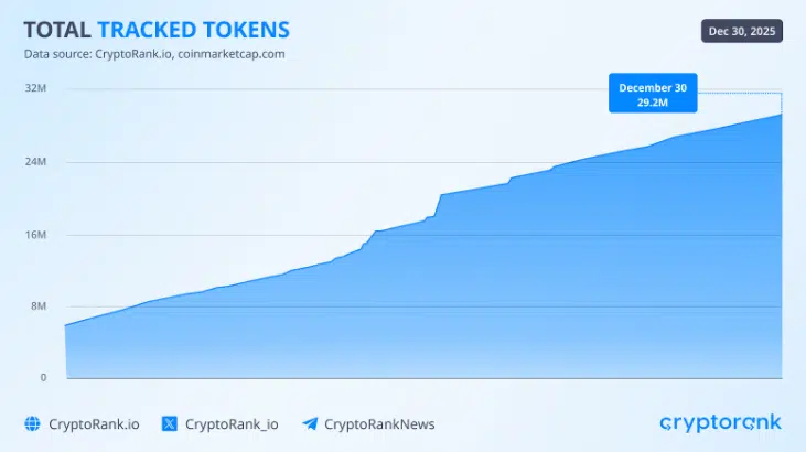 There are several key reasons why an altseason failed to materialize. One of them is the fragmentation of capital across narratives. New themes constantly replace older ones, making previous runners irrelevant. Each year, thousands of new tokens enter the market, diluting both attention and liquidity. As a result, the number of tokens tracked by CMC grew from 5.8M a year ago to 29.2M today.