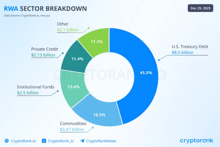 At the same time, other asset classes continued to grow and mature. Commodities expanded from $1B to $3.47B in on-chain value, while institutional funds grew from $185M to $2.5B. The fastest growth came from private credit, which increased from just $6M to $2.13B. This pattern shows that tokenization has gained traction first in areas where blockchain offers clear advantages, particularly fixed income and private credit. These assets translate well on-chain, supporting yield generation, collateralization, and treasury use cases without introducing significant volatility.