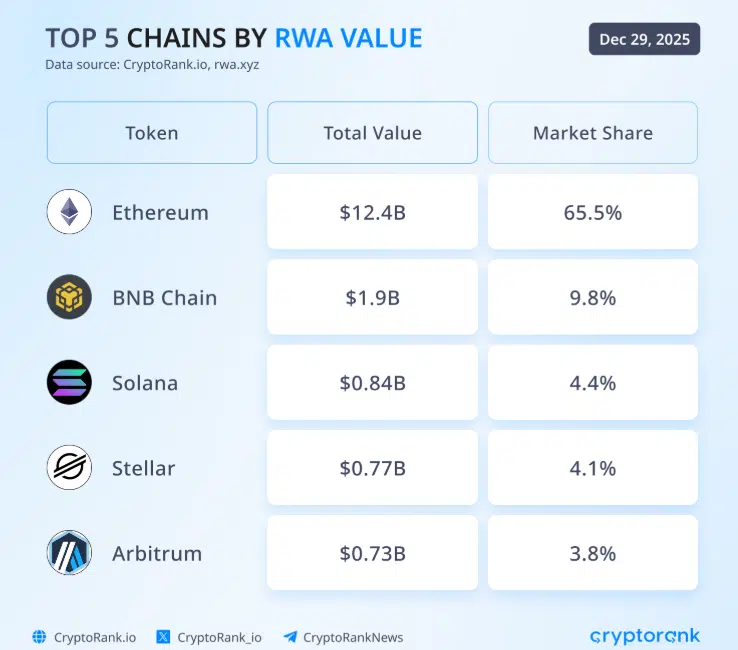 Ethereum remained the largest hub for RWAs, hosting $12.3B in asset value. It was followed by BNB Chain, Solana, Arbitrum, and Stellar. These figures include only so-called distributed assets, meaning RWAs that can be freely transferred between wallets.