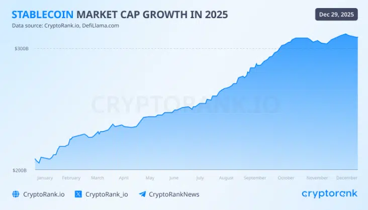 Regulatory progress and growing institutional adoption were reflected in on-chain metrics. Total stablecoin market capitalization grew by 50% in 2025, rising from $205B to $308B. This growth was led by USDT, whose circulating supply increased from 137B to 187B, while USDC supply expanded from 44B to 76B.