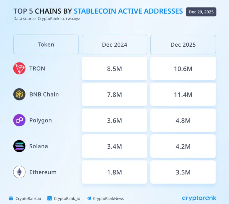 The ranking of the top five chains by stablecoin supply remained unchanged from January 2025. Ethereum continued to host 56% of total stablecoin supply, with circulation growing from $115.6B to $171.4B. TRON’s stablecoin supply rose from $57.9B to $80.6B, while Solana’s more than tripled during the year, reaching $16.3B.