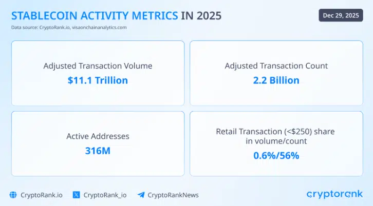Stablecoin transaction activity also surged. According to Visa, adjusted transaction count reached 2.2 billion in 2025, with adjusted transaction volume totaling $11.1 trillion. Notably, retail-sized transactions under $250 accounted for just 0.6% of total volume but represented 56% of transaction count. Over the past 12 months, there were 246M unique stablecoin sending addresses and 306M receiving addresses.