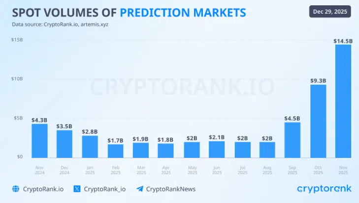 Prediction markets re-emerged as one of the strongest narratives in 2025, capturing significant CT mindshare. Although sector volumes declined after the U.S. elections in November 2024, user activity and traction returned. Monthly volumes hovered around $2B from winter through summer before breaking out in autumn. November became the strongest month on record, with total prediction market volume reaching $14.5B — more than 600% growth since February 2025, the first full post-election month.