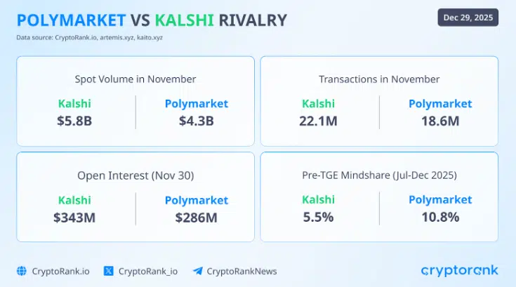 Kalshi’s growth outpaced Polymarket’s in several metrics. Monthly spot volume rose from $175M in January to $5.8B in November, a 3,200% increase. Spot transactions increased from 1.4M to 22.1M, while open interest declined from $476M to $335M.