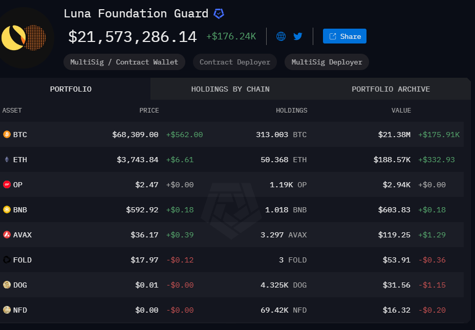 According to Arkham data, the address marked Luna Foundation Guard still contained 313 Bitcoin (BTC) worth approximately $21.3 million, 50,368 EThereum (ETH) worth $188.5 thousand, and small amounts of various altcoins.