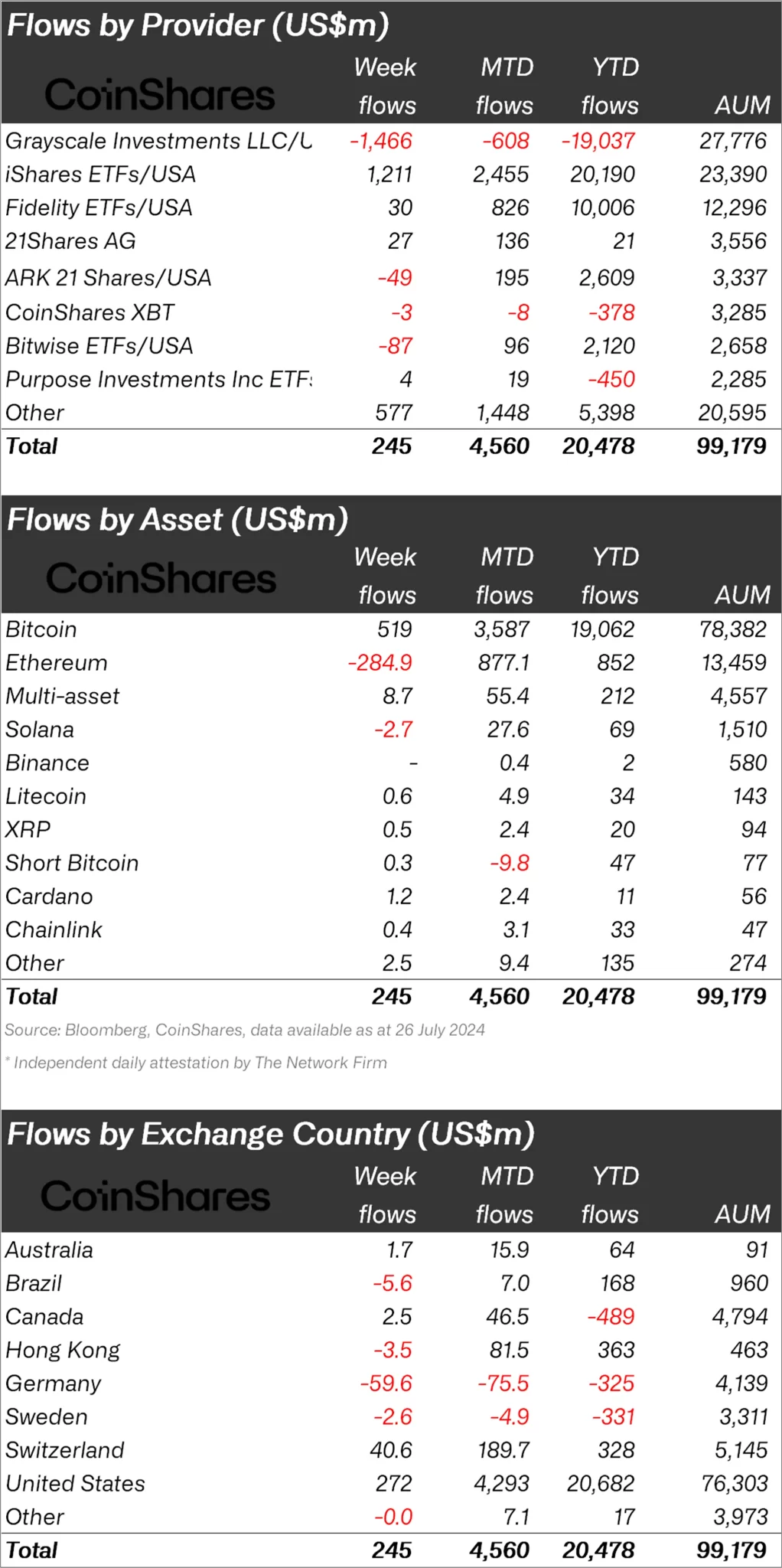 “Cryptocurrency investment products saw a relatively low inflow of $245 million last week.
