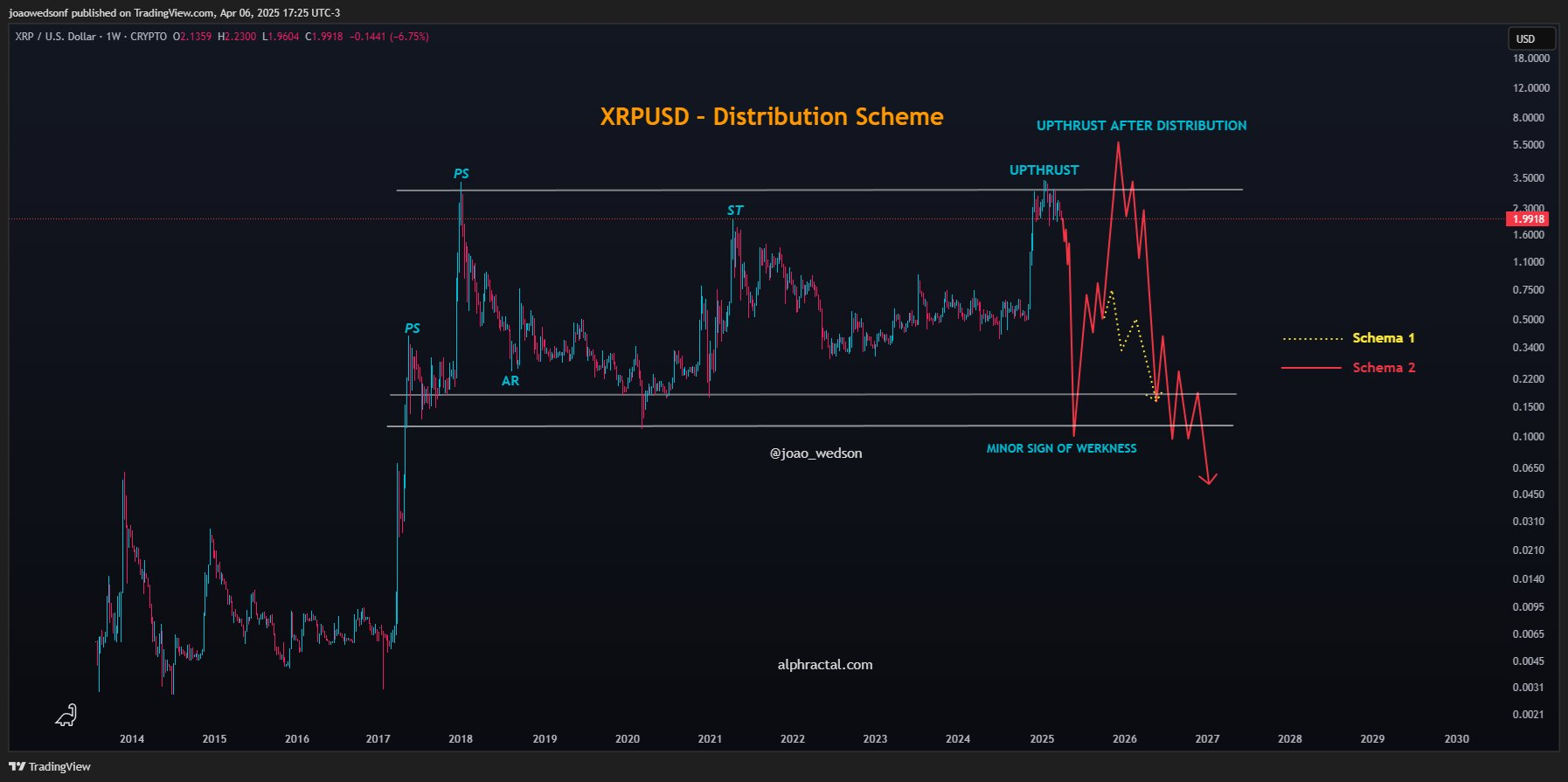 In a recent statement, Wedson responded to a follower’s question about the worst-case scenario for XRP by pointing to a potential long-term Distribution phase that could extend into late 2025. The forecast, based on complex technical chart models, suggests that the price of XRP could potentially fall to levels not seen since the 2020 market crash: