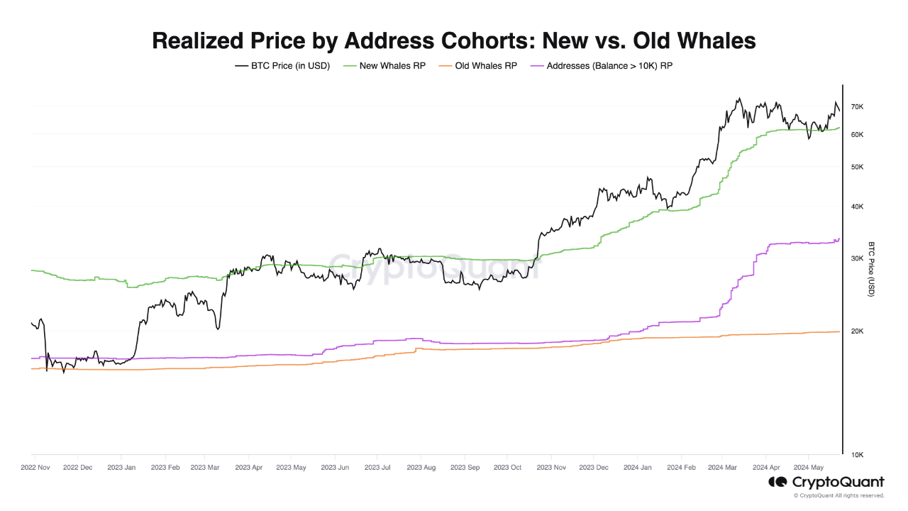 The firm analyzed realized price and supply trends across different Bitcoin address groups to understand market dynamics and future price impacts. The first chart presented by CryptoQuant shows realized price trends for new whales, old whales, and addresses with balances exceeding 10,000 BTC.
