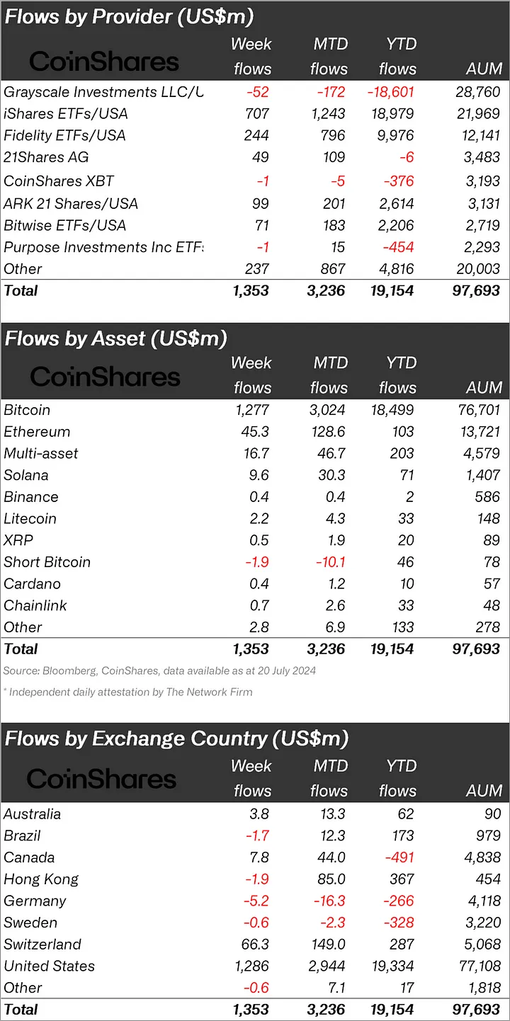 Coinshares, which stated that it experienced $1.354 billion inflows into cryptocurrency investment products last week, said that the inflows are continuing.
