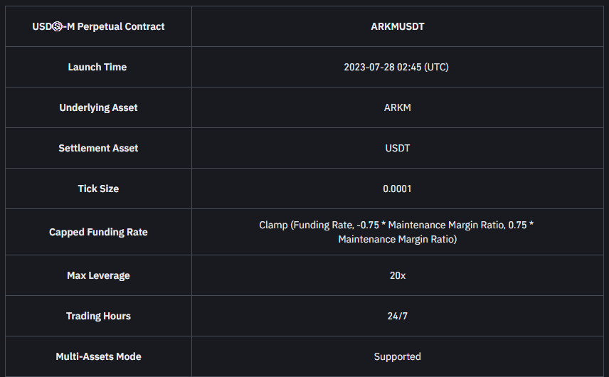 “Binance Futures will launch USDⓈ-M ARKM futures with up to 20x leverage on 2023-07-28 02:45 (UTC)”