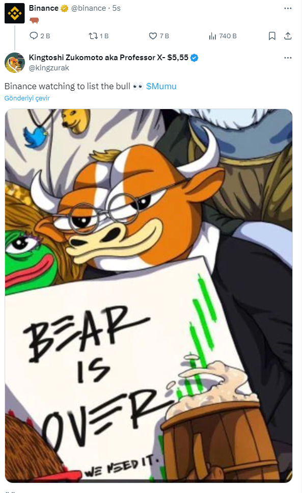 At this point, Binance only shared a bull picture from the X account today without writing anything. While many speculations emerged after this post, some users claimed that it could be a listing signal for the mem token called MUMU.