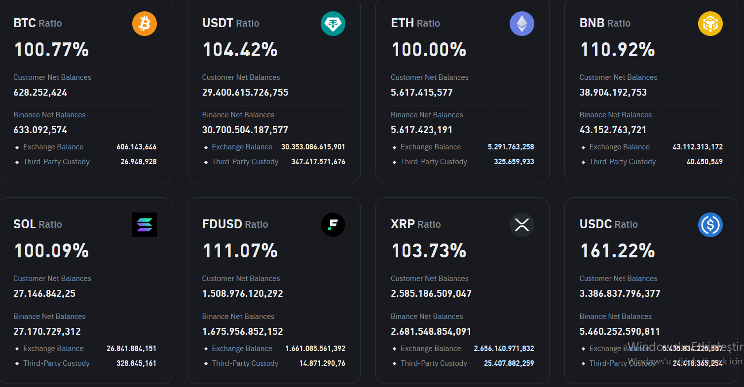 Binance’s latest proof of reserves shows that BTC, USDT, ETH, and BNB reserves are overcollateralized by 100.77%; 104.42%; 100.00% and 110.92% respectively.