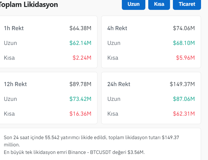 According to Coinglass's data, 62 million dollars in long positions were liquidated in the last hour. While a total of 149 million dollars were liquidated in the last 24 hours, the majority of them consisted of long positions.