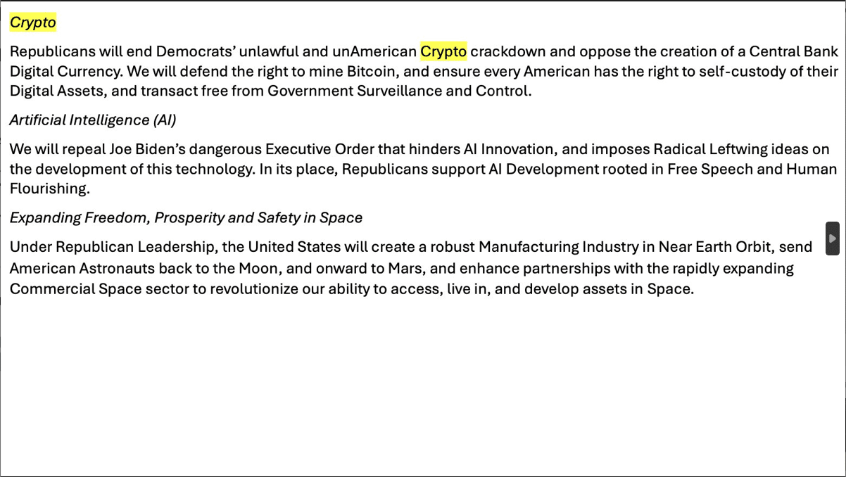 “Republicans will end Democrats' illegal and un-American Crypto push and oppose the creation of a Federal Reserve Digital Currency.