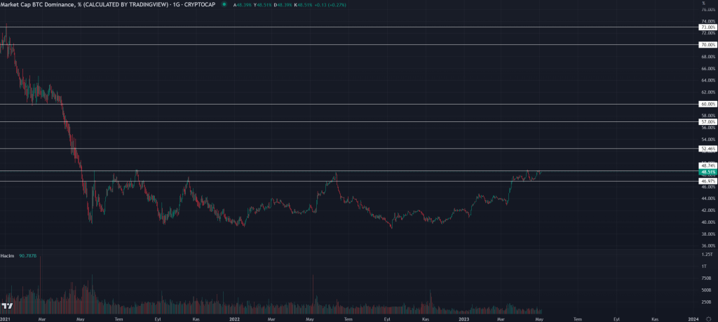 Especially, a break above 50 percent may cause altcoins to be more crushed against BTC. However, if the resistance level cannot be broken, a relaxation up to 42 percent is likely.