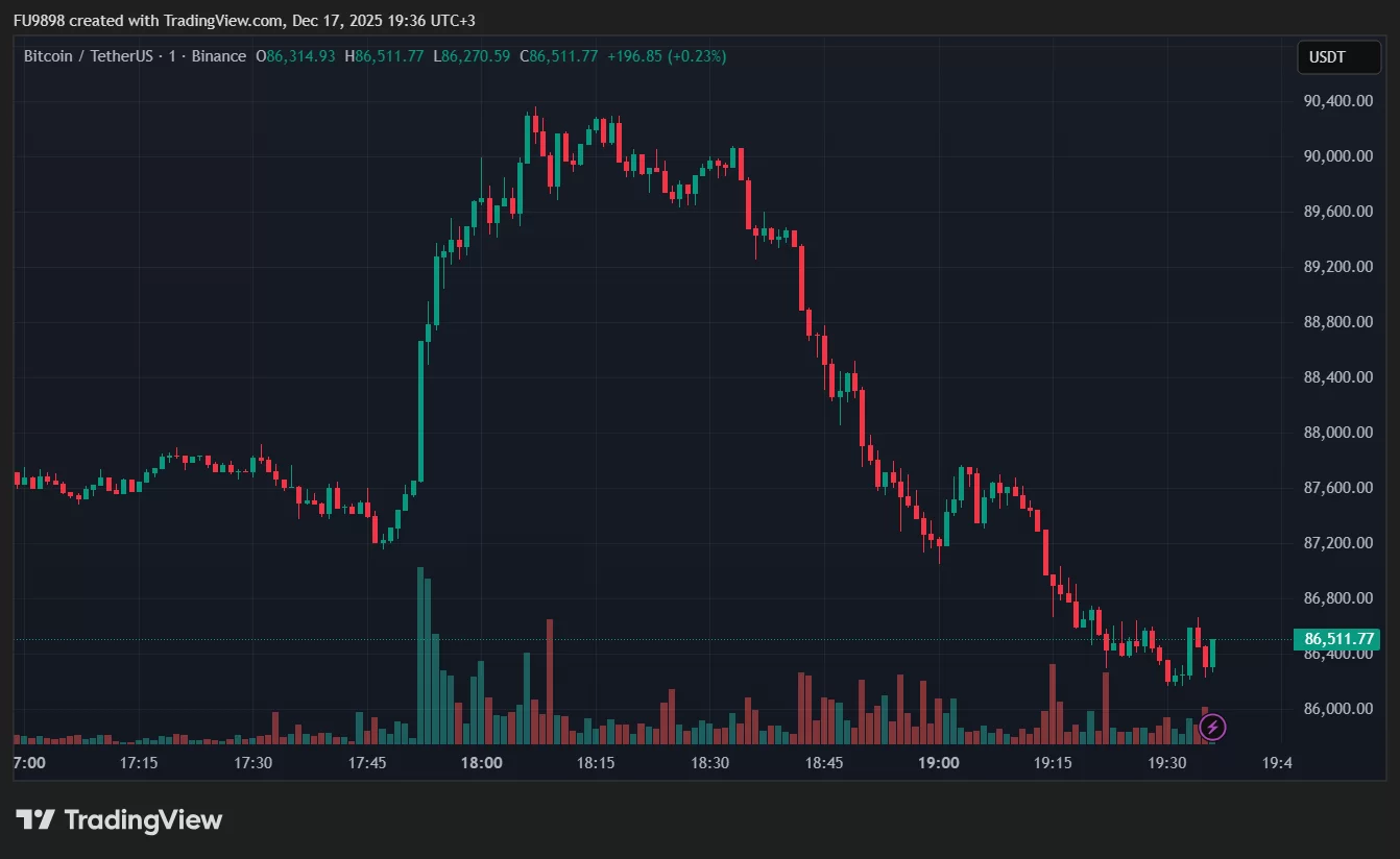 The world’s largest cryptocurrency, which rapidly rose from around $87,000, reversed its direction downwards as of 6:30 PM after surpassing $90,000. With a sharp 4.07% drop in the last hour, Bitcoin is trading at $86,362 at the time of writing.