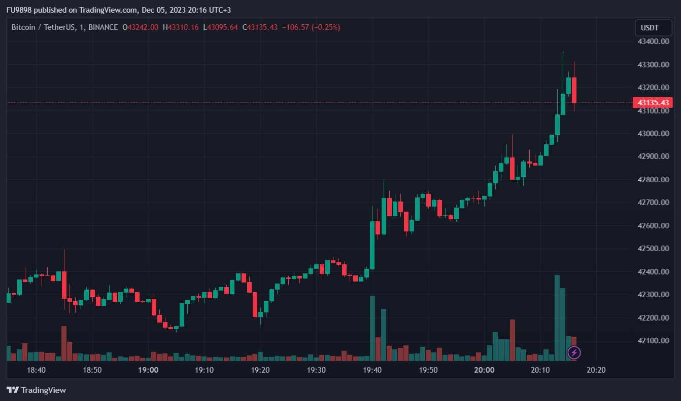 According to the latest data, the price of Bitcoin has exceeded $ 43,000 and is trading at $ 43,137 at the time of writing on the cryptocurrency exchange Binance.