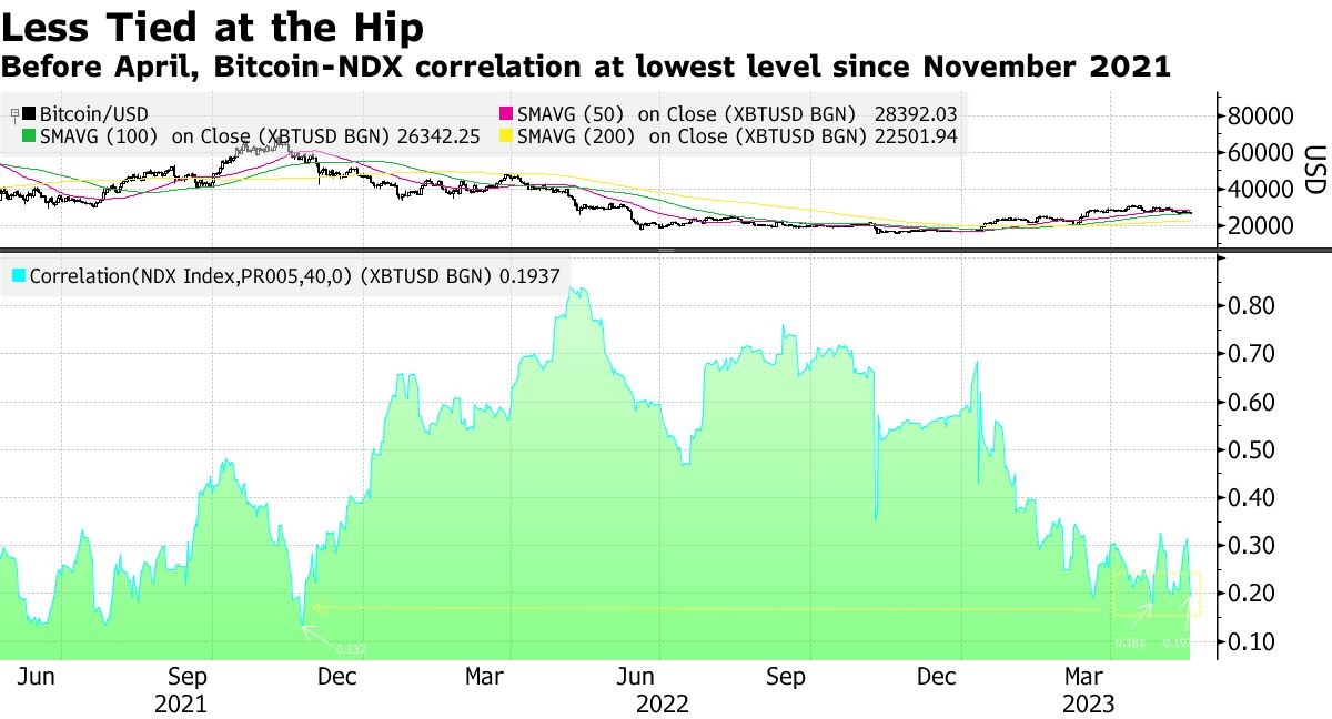 The 40-day correlation coefficient between Bitcoin and the Nasdaq dropped to 0.19 on Friday, hitting the lowest level since April 25. A value of +1 indicates that the assets are moving in the same direction, while a value of -1 means the opposite. Before April, the lowest value was seen in November 2021.