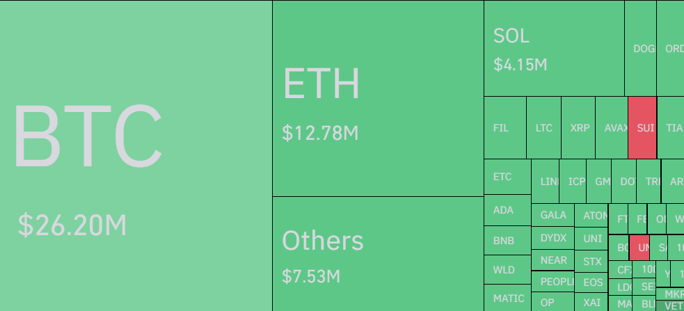 $25 million of the liquidations in long positions took place in Bitcoin, $12 million in Ethereum, and $4 million in Solana.