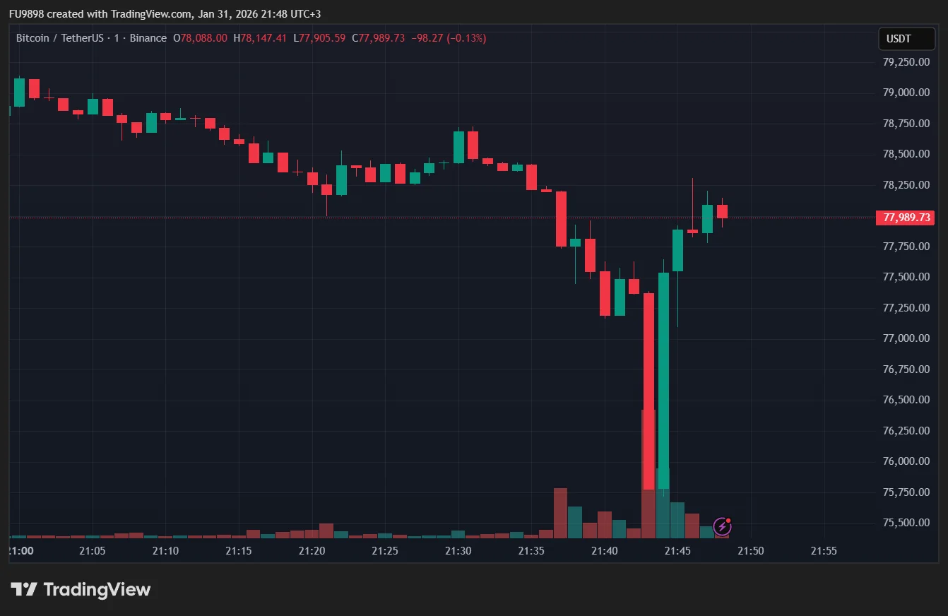 Bitcoin’s price fell below $77,000 due to intense selling pressure, reaching its lowest levels since April 2025.