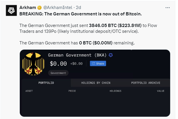 Arkham reported that Germany sent the last 3846 Bitcoins in its possession to the OTC service for sale and that Germany no longer had any Bitcoins left.