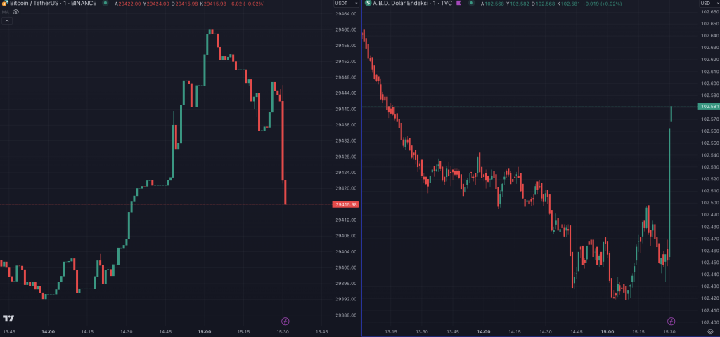 After the incoming PPI data, the first reaction of Bitcoin and Dollar was as follows: