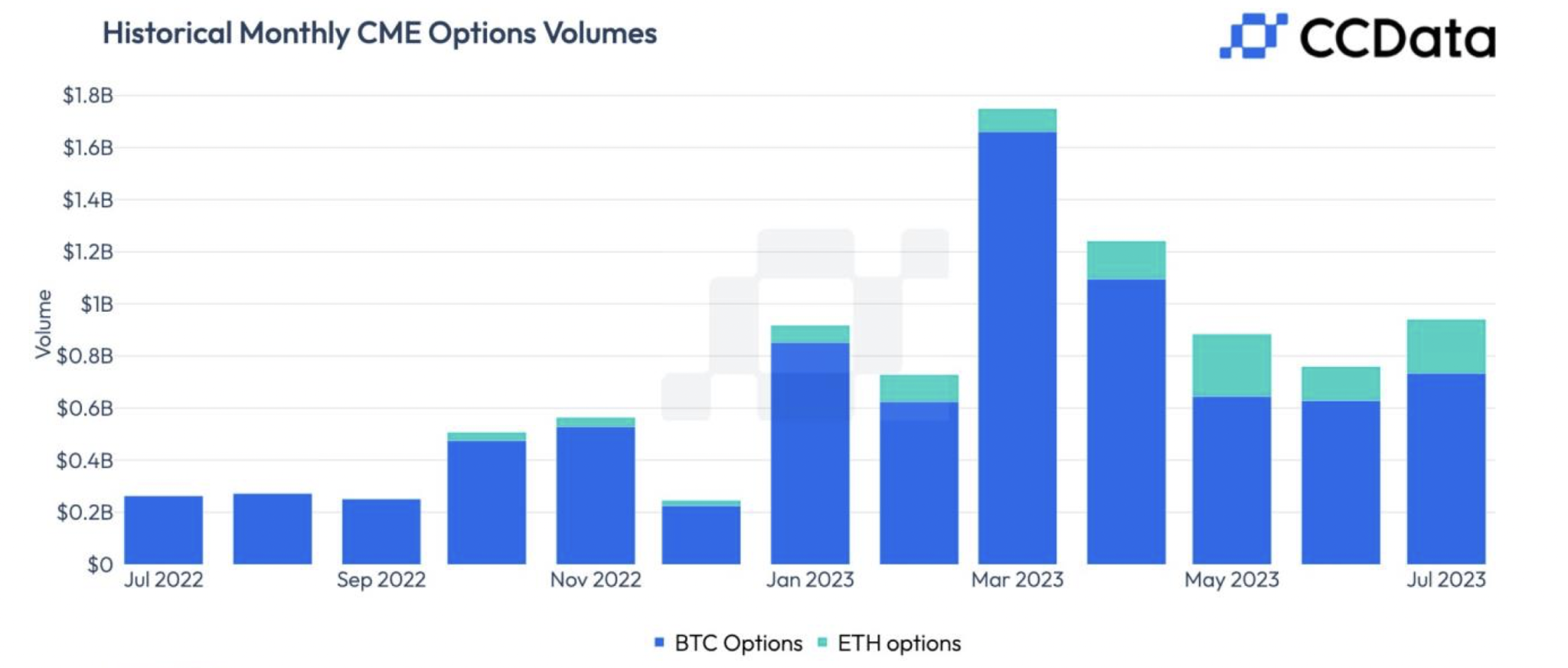 Crypto options trading volume on the Chicago Mercantile Exchange (CME) experienced significant growth in July, reaching nearly $1 billion.