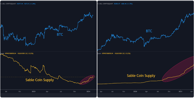 When we look at the 2020-2021 bull market, you can see that the supply of stablecoins increased rapidly, and there was a bull at that time too.