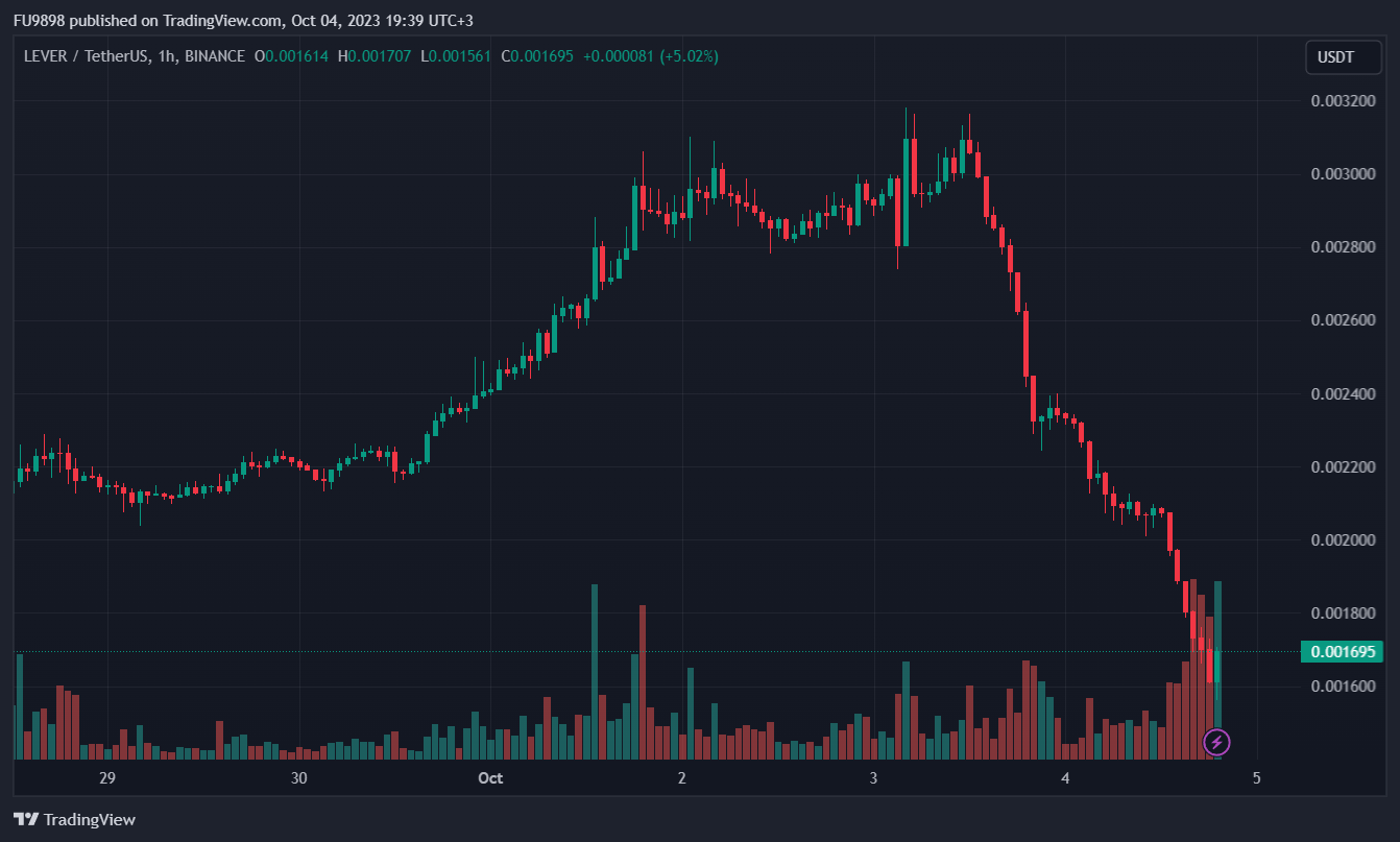 Following these transfers, the price of the token entered a sudden downward trend and at the time of writing this article, it dropped by 33% during the day. LEVER price is currently trading at $0.001683.