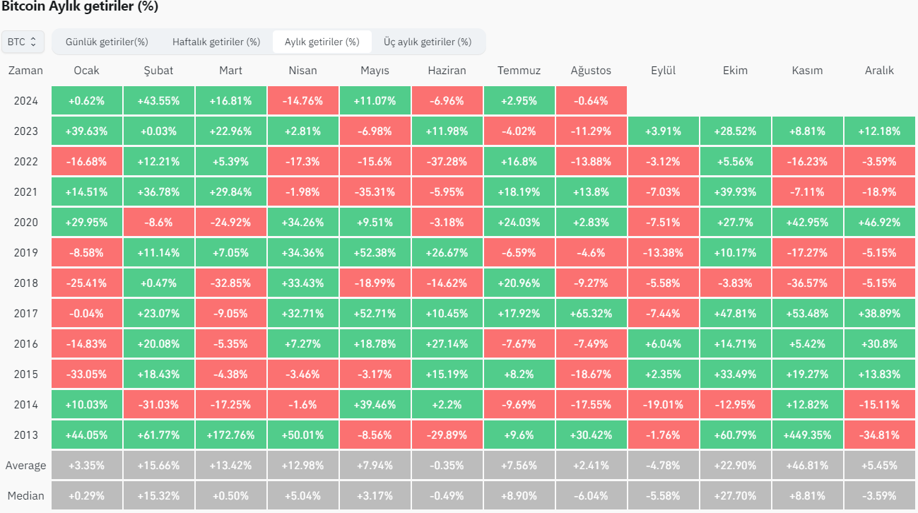 When we look at the Bitcoin monthly return table above, we can generalize that March, August and September are the months of decline; We see that February, July, October and November are the rising months.