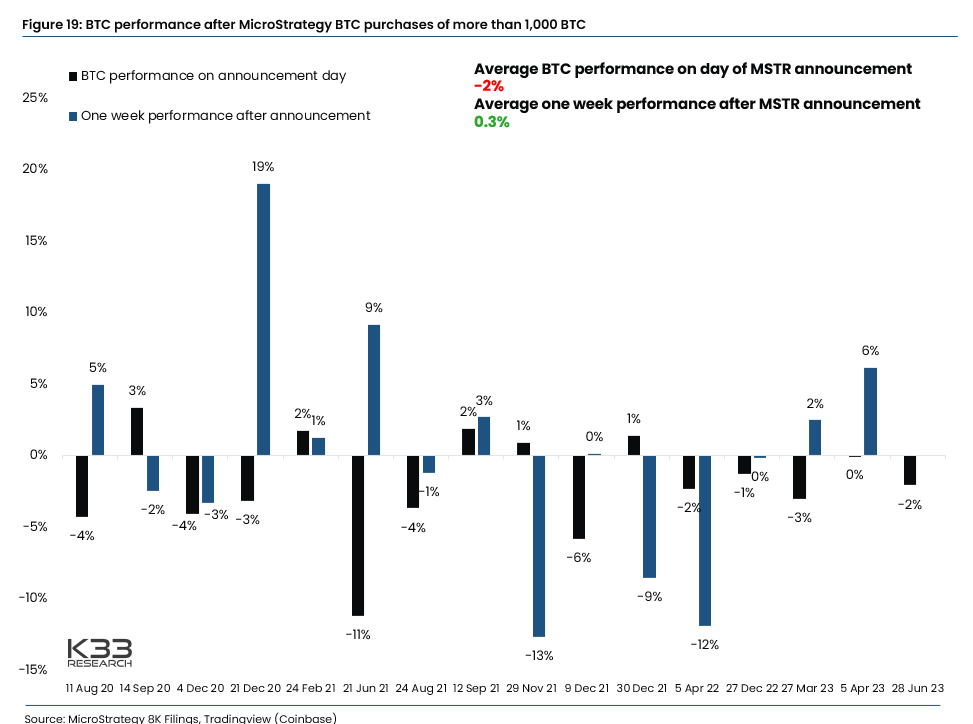 In fact, according to data from K33, Bitcoin's average weekly return has been slightly positive after MicroStrategy's purchases.