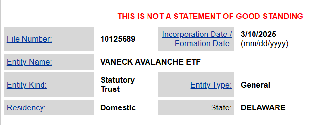 According to its official filing page, VanEck registered an AVAX ETF in Delaware on March 10. However, this does not constitute approval.