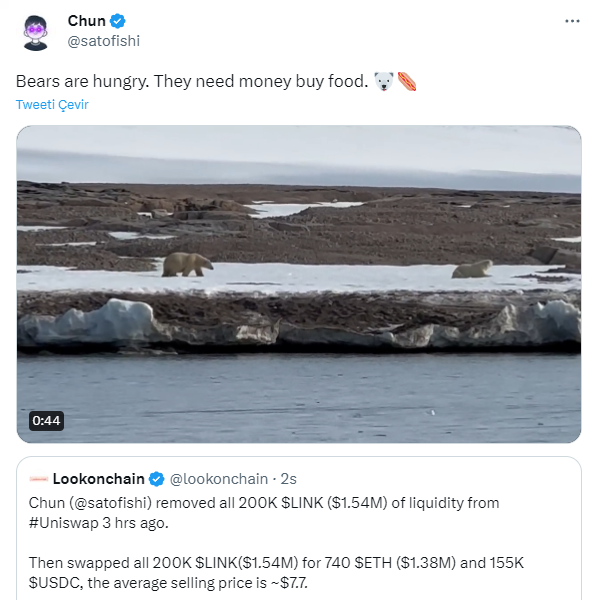 Citing Lookonchain's post, Wang shared a video about polar bears and said, “Bears are hungry. They need money to buy food.”