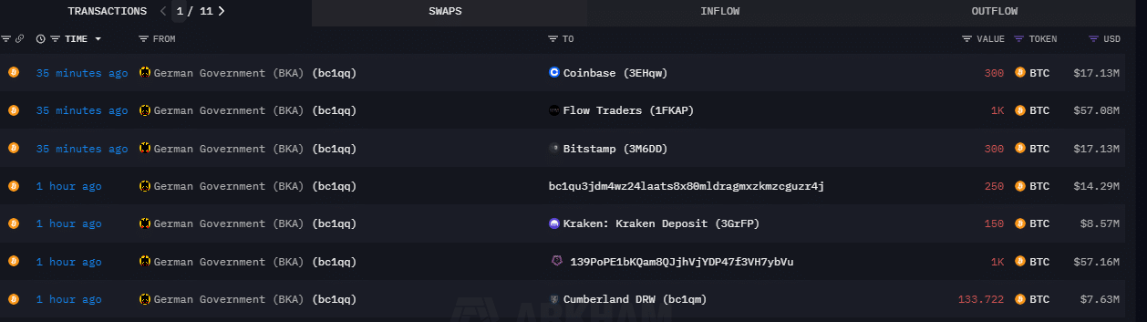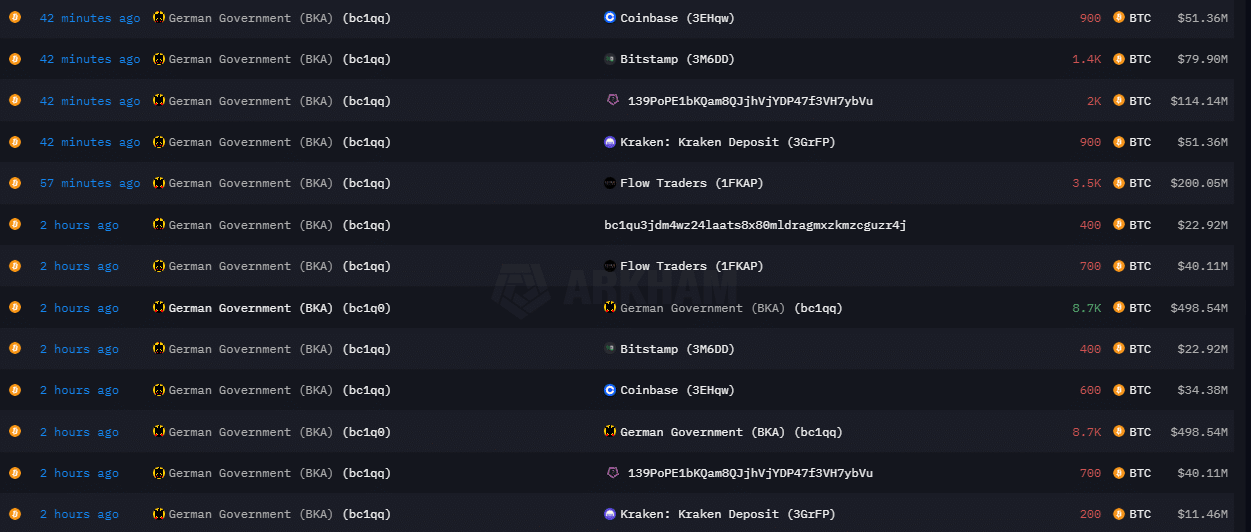 According to Arkham data, a German government address transferred approximately 3,133 BTC ($170 million) to crypto exchanges and crypto market makers in the last hour.