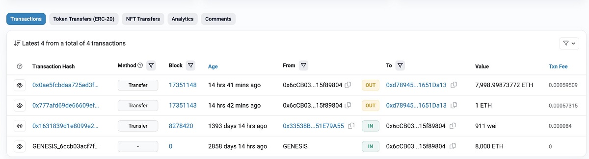 The transaction was spotted by blockchain analytics firm Lookonchain, which tracks large and unusual cryptocurrency transfers. According to the data, the investor bought 8000 ETH for just $0.3 each during the Ethereum ICO held from July to September 2014.