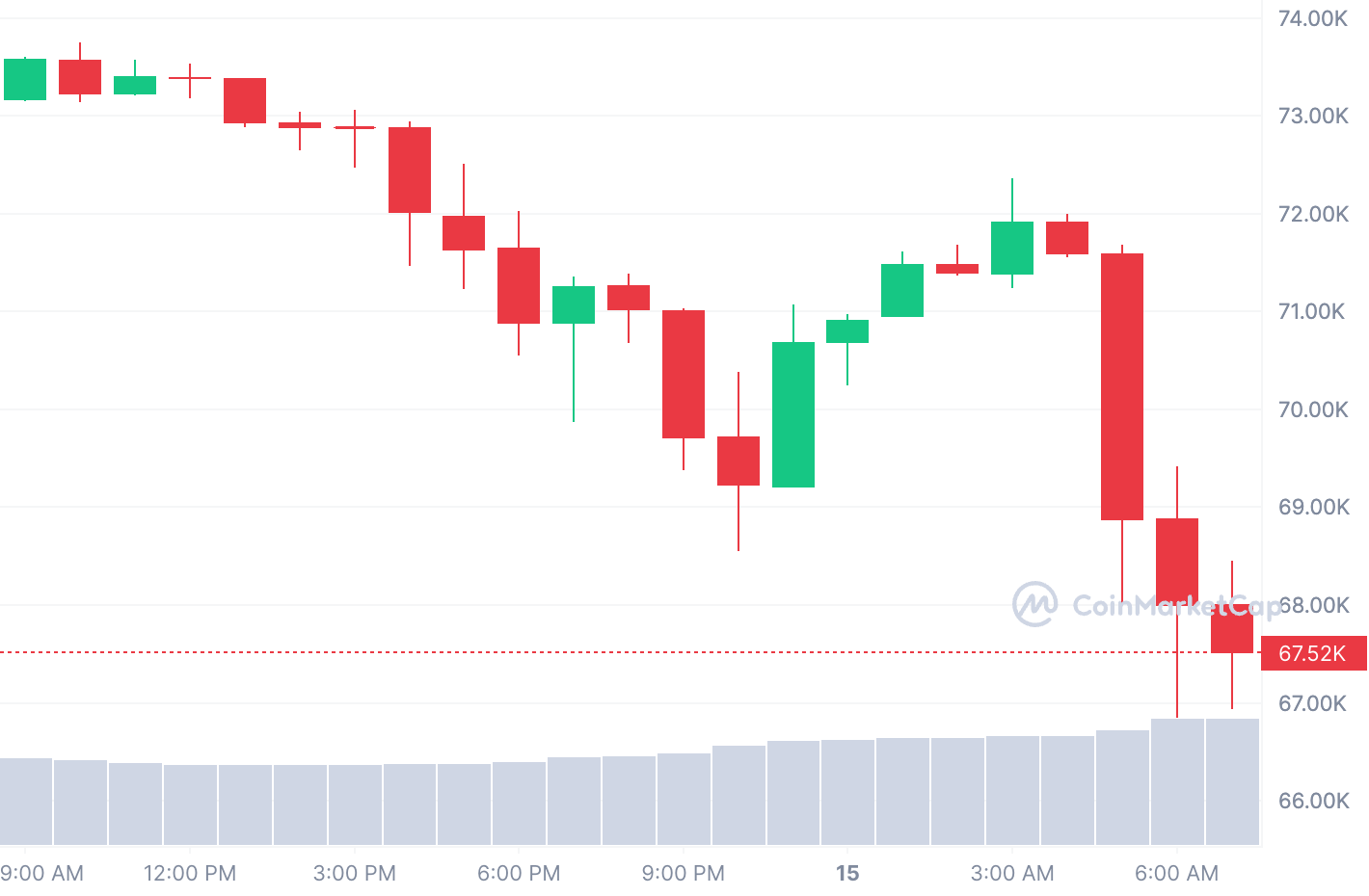 Bitcoin, the world's largest cryptocurrency, experienced a decline overnight and fell to $66,700 before making a partial recovery.