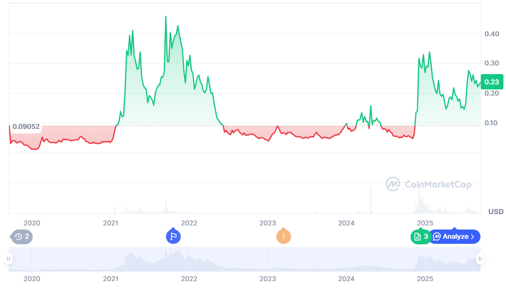 Hedera is the other half of this equation. Trading at $0.2358, it carries a market cap of $9.99 billion and a 24-hour volume of $209.43 million. In the past 24 hours, it dipped 0.53%, but over the last week it gained 1.56%. The monthly chart shows a 1.9% decline, while yearly performance reflects a staggering 374.98% increase. Despite being 43.35% below its all-time high of $0.5701 (September 2021), Hedera’s growth trajectory suggests resilience. Its all-time low of $0.01001 (January 2020) now feels like ancient history given its adoption curve.