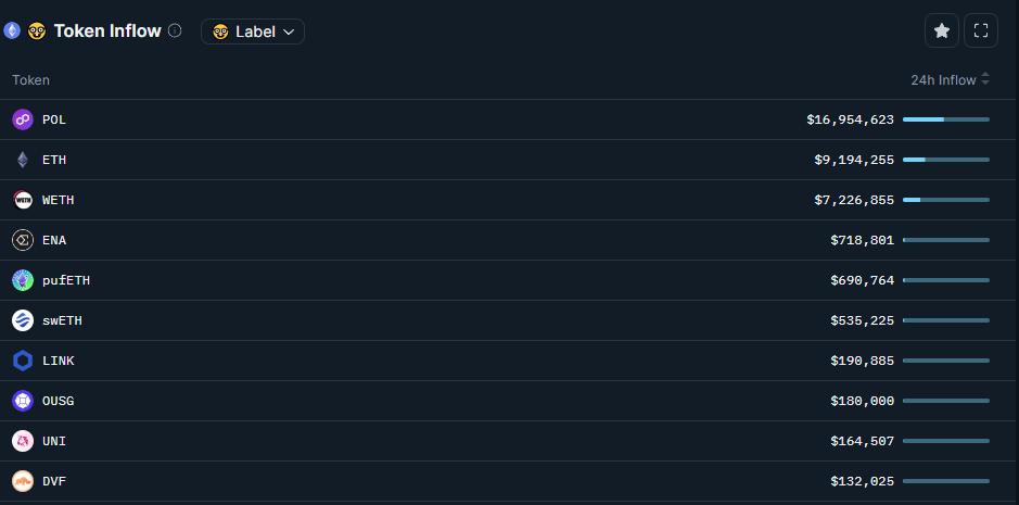 POL recorded an inflow of $16.9 million in the last 24 hours, while ETH recorded an inflow of $9.1 million and WETH $7.2 million.