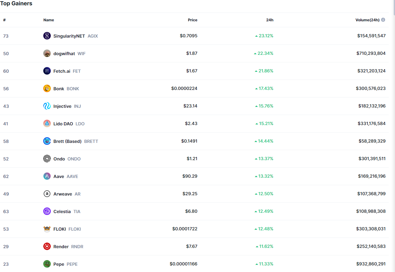 According to CoinMarketCap data, SingularityNET (AGIX) 23.1%; Dogwifhat (WIF) 22.3%; Fetch.ai (FET) and BONK were among the altcoins with a positive separation from the market, with an increase of 21.8% and 17.4%.