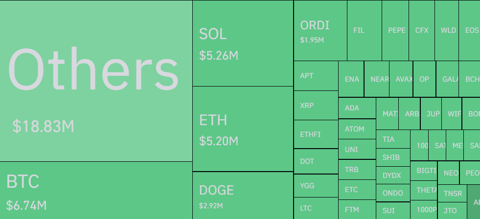 Among the most liquidated cryptocurrencies, Bitcoin took the lead with $6.74 million, Solana with $5.26 million, Ethereum with $5.20 million, and Dogecoin with $2.92 million.
