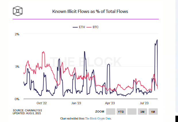 Total illegal flows in Ethereum reached nearly 2% last week, according to Chainalysis data.
